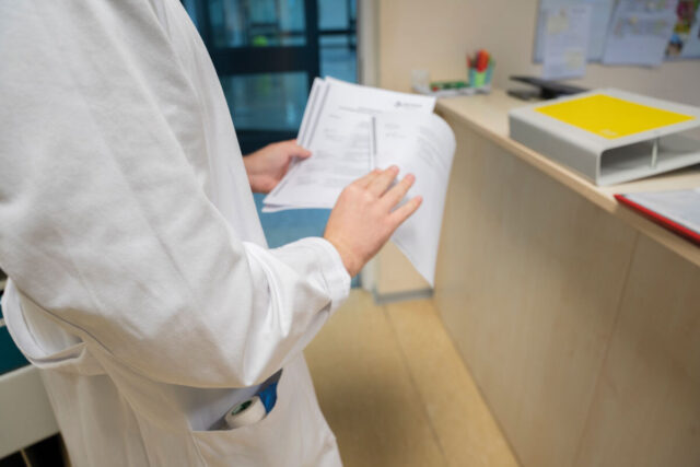 Im Arztzimmer widmet sich Pascal Hagenah der nächsten Aufgabe: die Vorbereitung des Arztbriefes für den Patienten, der heute entlassen werden soll. Sorgfältig fasst er alle relevanten medizinischen Informationen zusammen – von der Diagnose über die durchgeführten Behandlungen bis hin zu den empfohlenen Nachsorgemaßnahmen. Der Arztbrief dient als wichtige Grundlage für die weitere Behandlung und Nachsorge, sowohl für den Patienten als auch für andere behandelnde Ärzte.