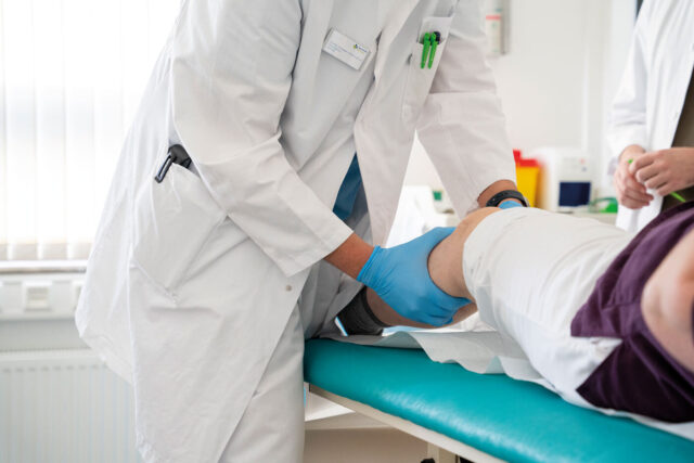 Im vorstationären Bereich begrüßt er eine Mutter mit ihrem 16-jährigen Sohn, der am nächsten Tag wegen einer Kreuzbandruptur operiert werden soll. Die Untersuchung beginnt mit einer gründlichen Anamnese, bei der er den Patienten nach seiner Krankengeschichte und aktuellen Beschwerden befragt. Die Antwort auf die Frage „Hatten Sie schon mal eine Operation am linken Knie?“ interessiert ihn besonders, um etwaige Risiken oder Komplikationen besser einschätzen zu können. Auch die Medikamenteneinnahme, Vorerkrankungen, Allergien und die sportliche Aktivität werden erfragt. Der 16-Jährige spielt regelmäßig Fußball. Anschließend folgt die Untersuchung des Knies, bei der Pascal Hagenah erneut prüft, wie weit sich das Bein präoperativ beugen und strecken lässt, da dies für den Heilungsverlauf ausschlaggebend ist.