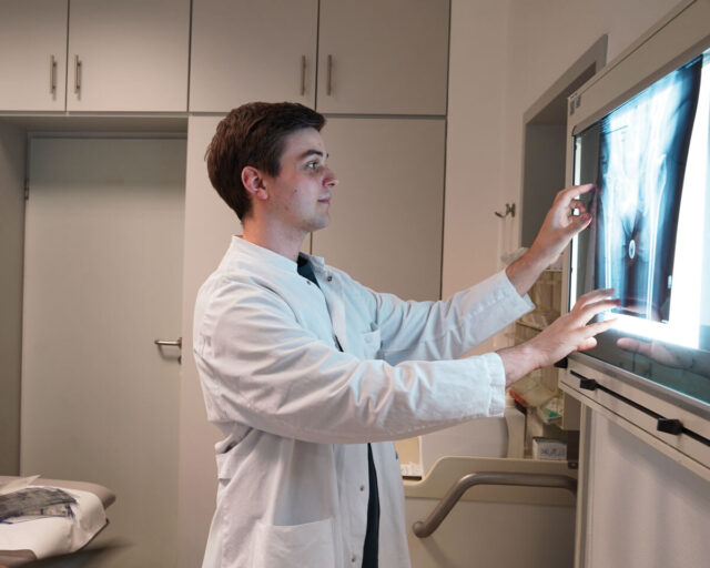 Anschließend werden die Röntgenbilder aus dem Notdienst des Vortages gesichtet. Dabei wird dokumentiert, welche Patienten während des Dienstes aufgenommen wurden, wie die Fraktur entstanden ist, welche Maßnahmen ergriffen wurden beziehungsweise werden und wie die aktuellen Bilder zu beurteilen sind.