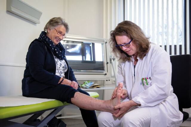 Andrea Knichel: Für Patienten, für die ein operativer Eingriff mit hohen Risiken verbunden ist, ist ein orthopädischer Maßschuh das Sinnvollste. Dieser wird nach einem Gipsabdruck oder einer Laservermessung maßgefertigt. Er bettet und stützt den Fuß und das Sprunggelenk in der vom Fuß vorgegebenen Stellung und reduziert so Überlastungsschmerzen und Druckstellen.